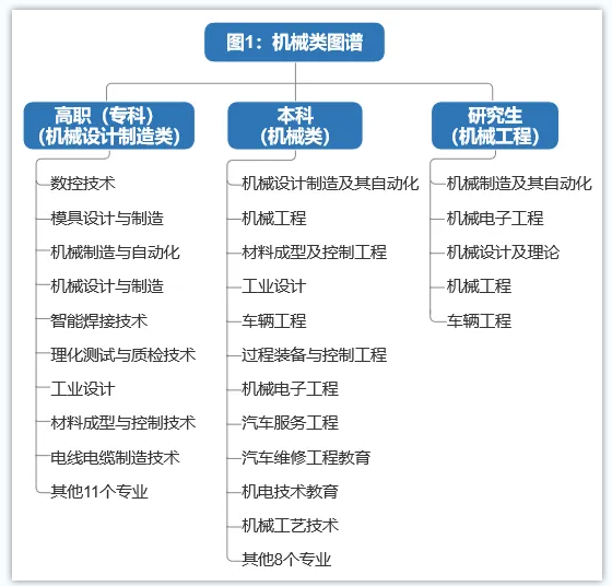 學(xué)職平臺專(zhuān)業(yè)人才庫顯示,約有12.6萬(wàn)人畢業(yè)于機械類(lèi)專(zhuān)業(yè),不同學(xué)歷層次在專(zhuān)業(yè)設置上各有側重(如圖1)。