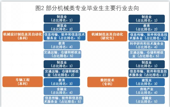 除制造業(yè)外,教育業(yè)、信息和建筑行業(yè)等都是機械類(lèi)畢業(yè)生的主要就業(yè)去向。具體分專(zhuān)業(yè)來(lái)看,以各學(xué)歷層次畢業(yè)人數較多的專(zhuān)業(yè)為例(圖2)。