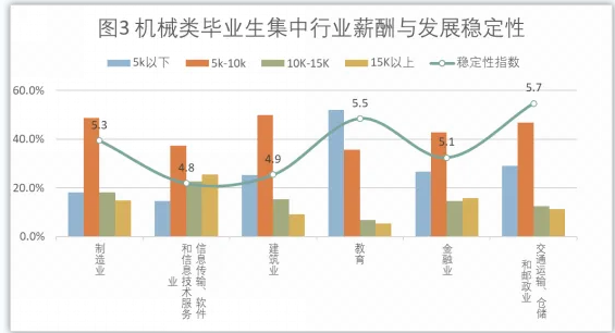 從機械類(lèi)人才的行業(yè)薪酬和就業(yè)穩定性來(lái)看(如圖3),吸收了大量機械類(lèi)人才就業(yè)的制造業(yè)薪酬僅次于信息行業(yè),略高于金融業(yè),遠高于建筑業(yè)、教育業(yè)及交通業(yè)。根據畢業(yè)生對就業(yè)穩定性評價(jià)情況,制造業(yè)的穩定性(5.3)遠超過(guò)信息行業(yè)(4.8),次于交通運輸(5.7)和教育行業(yè)(5.5)。