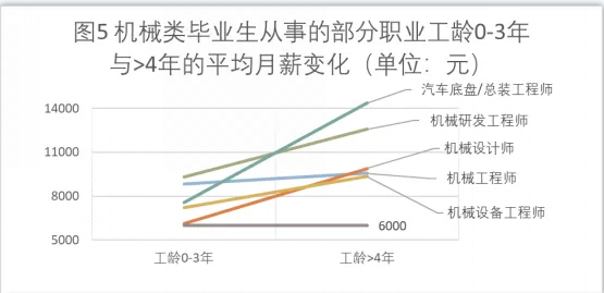 同時(shí),機械類(lèi)人才職業(yè)薪酬還受工齡影響(圖3)??傮w來(lái)看,五大工程師崗位從業(yè)3年內的平均月薪都超過(guò)6000元,從業(yè)4年后的薪酬均呈上升趨勢,其中汽車(chē)底盤(pán)/總裝工程師平均月薪增幅最大,接近翻番。