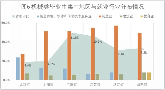 從機械類(lèi)專(zhuān)業(yè)畢業(yè)畢業(yè)生就業(yè)的城市來(lái)看,如圖6所示,工業(yè)基礎較好的東部沿海地區如廣東省、江蘇省、山東省、浙江省、上海市,以及北京市等地是機械類(lèi)人才主要聚集地。山東省以“制造業(yè)+教育業(yè)+建筑業(yè)”為主導,除山東省外,其余地區的機械類(lèi)人才就業(yè)行業(yè)結構呈現出“制造業(yè)+信息業(yè)+建筑業(yè)”的特點(diǎn)。