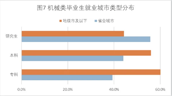 具體到城市類(lèi)型,機械類(lèi)畢業(yè)生在省會(huì )城市和地級市及以下就業(yè)的比例為13:20,專(zhuān)科生、本科生、研究生占比如圖7所示。數據表明,機械類(lèi)畢業(yè)生就業(yè)地域分布存在“重心下沉”現象,這與制造火箭、飛機、船舶、列車(chē)等大型企業(yè)的地區分布及制造業(yè)的產(chǎn)業(yè)集聚發(fā)展存在一定相關(guān)。