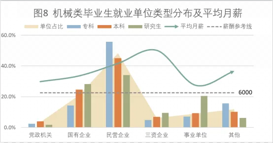 同時(shí),從畢業(yè)生就業(yè)單位類(lèi)型分布來(lái)看(圖8),近半數(48.4%)的畢業(yè)生選擇進(jìn)入民營(yíng)企業(yè)工作,各學(xué)歷層次的畢業(yè)生在民營(yíng)企業(yè)工作的比例均排在第一位,且畢業(yè)4年后,機械類(lèi)人才在民營(yíng)企業(yè)的平均月薪接近薪酬參考線(xiàn)6000元的2倍,僅次于三資企業(yè)。